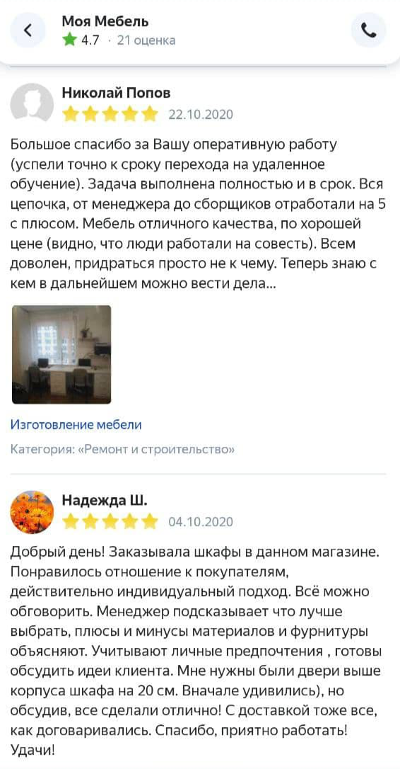 Меня зовут Марина и я уже более 15 лет работаю главным технологом на фабрике Моя Мебель. За это время мы выработали уникальную систему производства корпусной мебели без сколов и с минимальными допусками. Я с радостью помогу Вам подобрать мебель под любой интерьер и любых размеров. Наши курьеры поднимут изделие на Ваш этаж, даже если лифт не работает, а сборщики установят все за один день, без пыли и мусора.